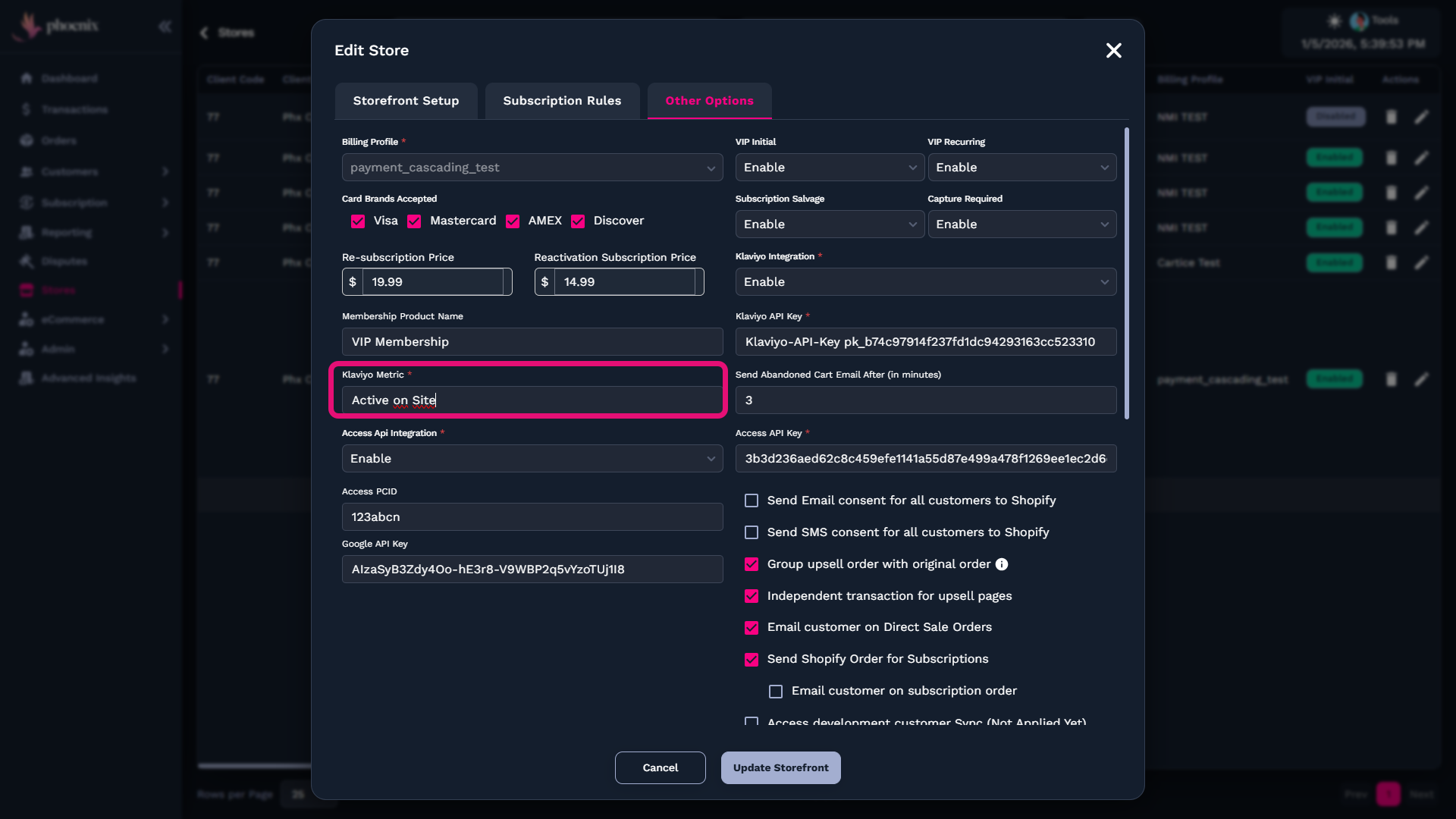 If you plan to use Klaviyo, locate the Klaviyo section within the store settings and enable the integration. After enabling it, notify the Phoenix team so they can assist with setup and ensure the integration works correctly.